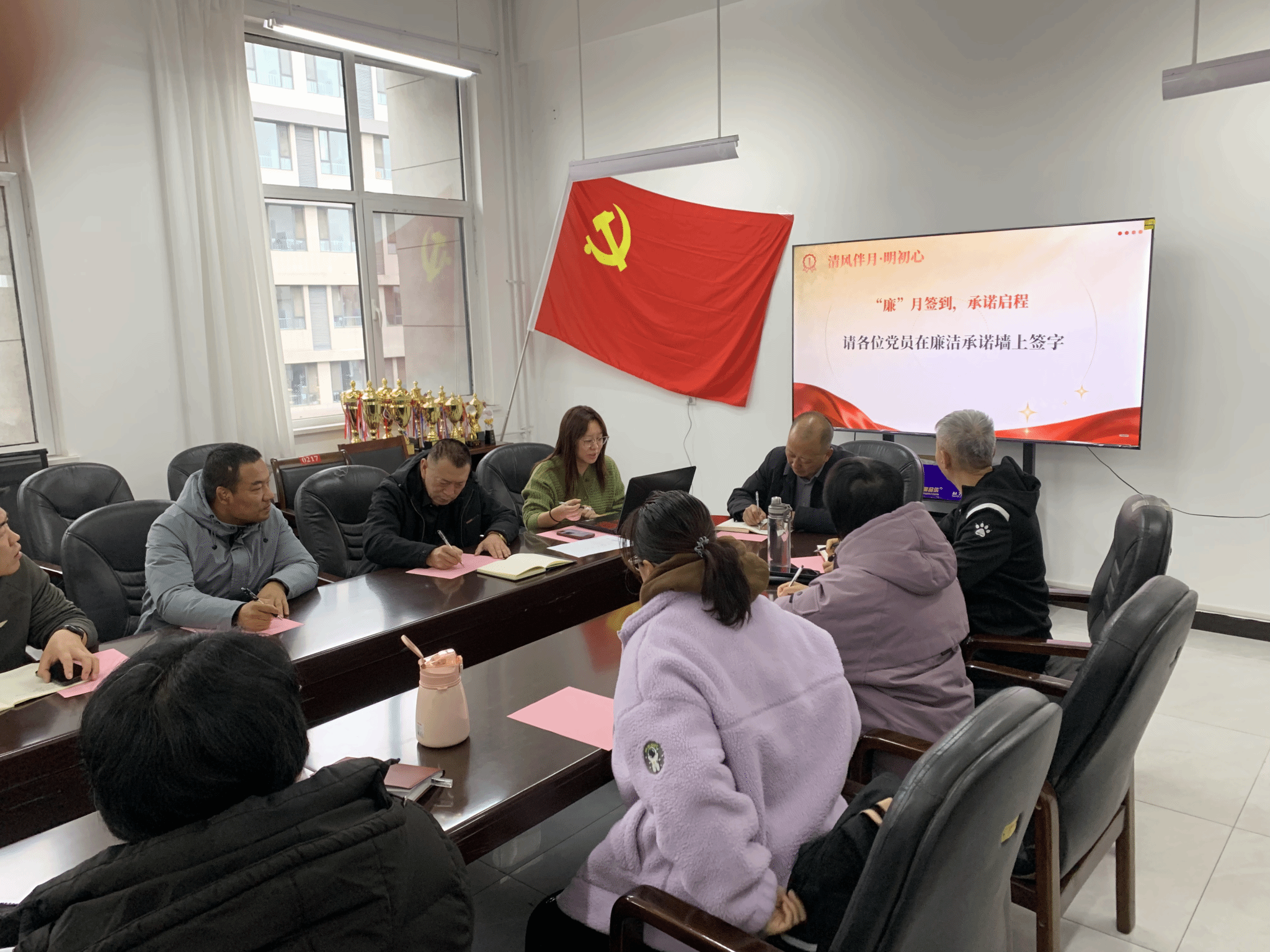 活动伊始,支部紧扣“月圆”象征的团圆、清廉、初心与“党旗红”代表的党的领导、红色底蕴,明确了活动主题。通过“廉”月签到环节,党员同志们在廉洁承诺版上郑重签名,许下廉洁自律的承诺,为活动奠定了庄重而积极的基调。随后,在党支部书记的带领下,全体党员面向党旗,重温入党誓词。庄严的仪式有效唤醒了每位党员的入党初心和身份意识,强化了党员的责任感与使命感。