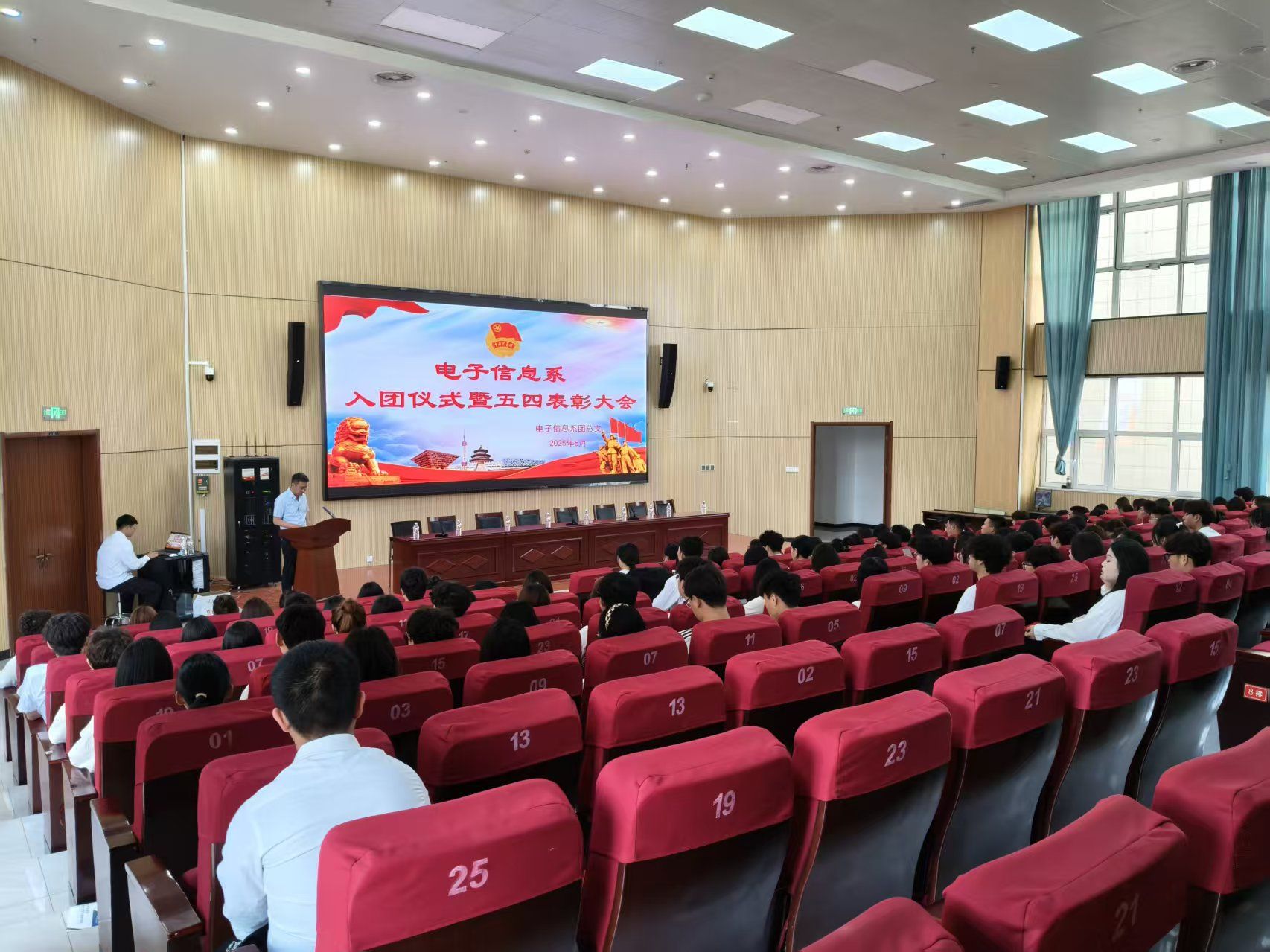 最后,全体人员起立奏唱《光荣啊,中国共青团》,激昂的旋律将仪式推向高潮。团总支负责人在总结中号召同学们牢记入团誓词与表彰荣誉,以此次活动为新起点,在新时代的征程中书写属于电子信息系青年的青春华章。