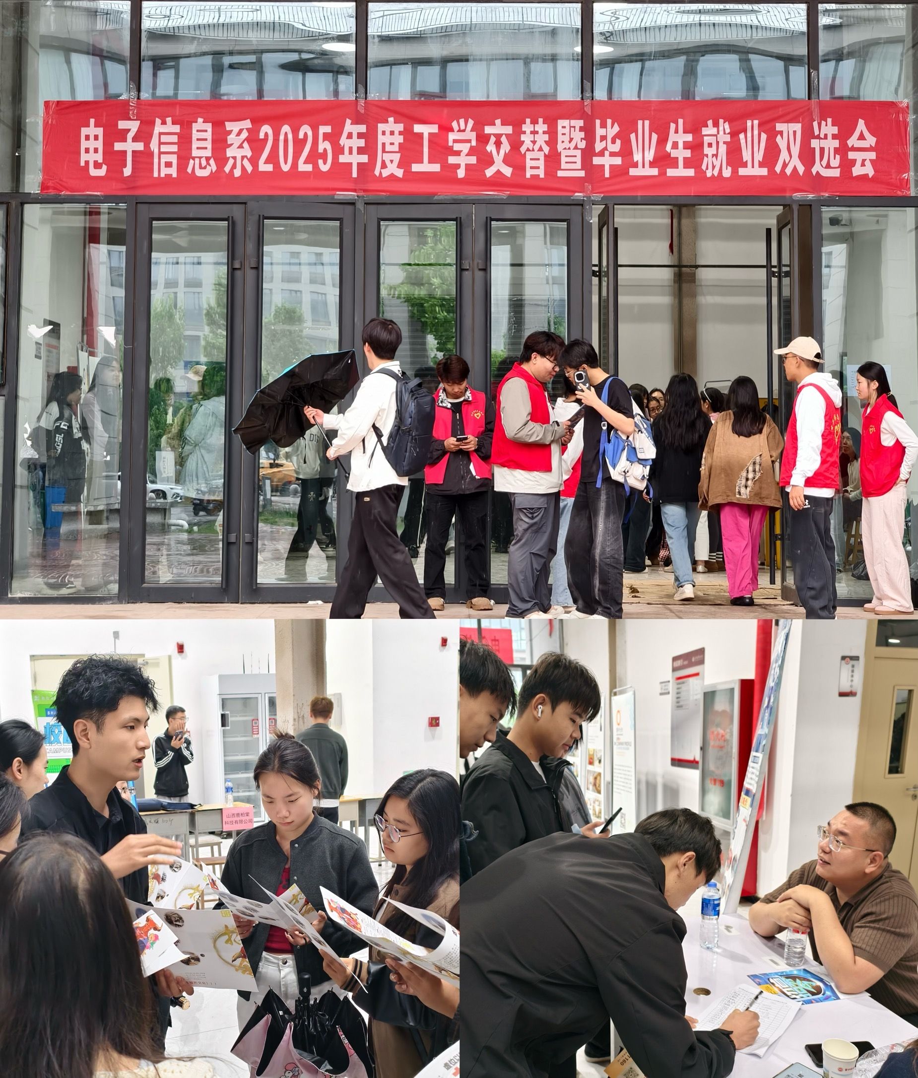 为助力学生毕业季就业冲刺,解决学生“最后一公里” 需求,5月22日下午3时,电子信息系2025年度工学交替暨毕业生就业双选会在电子信息系D 楼大厅火热启幕。现场气氛热烈,成果丰硕。