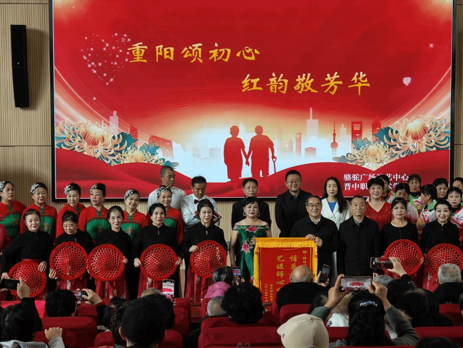 随后,学院退休教职工代表与骆驼广场演艺中心共同为老同志们呈献了一场以“重阳颂初心 红韵敬芳华”为主题的文化盛宴。文艺节目精彩不断,翩跹的舞蹈展现岁月风采,激昂的朗诵抒发家国情怀,诙谐的小品传递真挚温情,悠扬婉转的歌曲更添韵味。一个个精心编排的节目接连登场,最动人的篇章由 87 岁高龄的老党员书写。他精神矍铄、步履稳健,接过话筒便引吭高歌,熟悉旋律在大厅激荡,苍劲歌声里既有岁月沉淀的醇厚,更有“离岗不离党”的执着。终场时,全场师生高声齐唱《歌唱祖国》,旋律中听见了初心回响,在家国情怀的共鸣中,老同志们切实感受到了“回家”的温暖与学院的关怀。