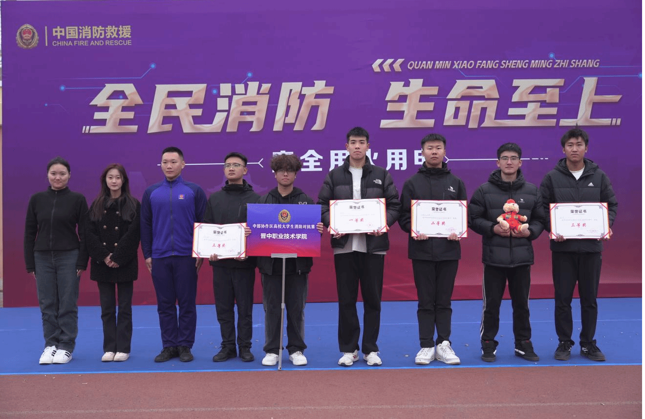 为进一步强化学生消防安全意识,提升应急避险与自救互救能力,积极响应晋中市“119”消防宣传月活动号召,院学生处联合校园管理处保卫科组建了一支由10名学生组成的参赛队伍,于11月6日上午赴山西能源学院参加晋中市“119”消防宣传月启动仪式暨中部协作区高校大学生消防对抗赛,在与来自大学城10所高校及山西省内其他高校的200余名学生激烈角逐中,晋中职院学子凭借扎实的技能功底和顽强的拼搏精神斩获多项荣誉,充分展现了新时代大学生的责任担当与青春风采。
