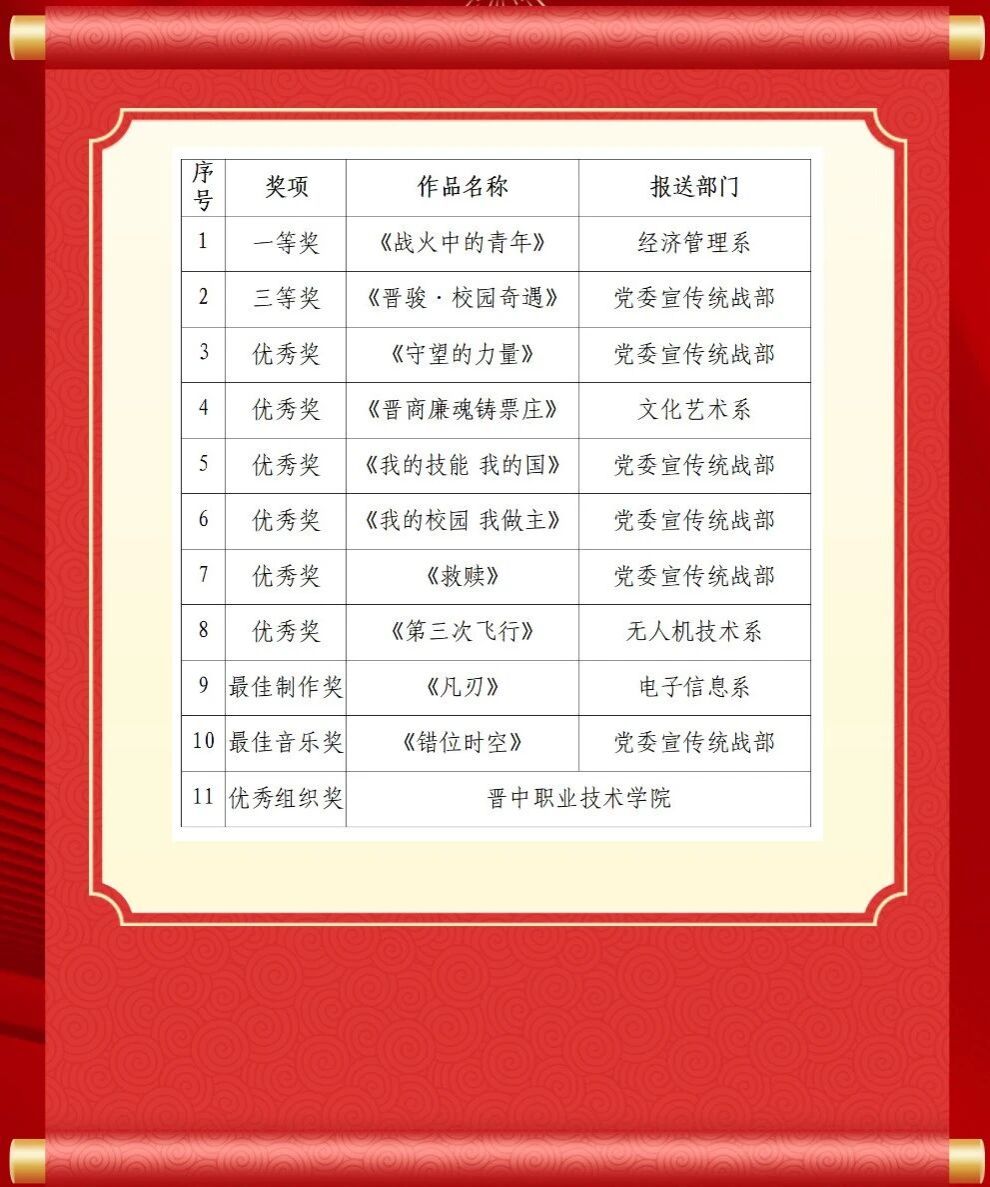 同期举办的第二届 “万讯杯” 校园微电影(短视频)大赛传来捷报。晋中职院学子凭借扎实的专业功底与新颖的创作视角大放异彩,参赛作品从300余件作品中脱颖而出,一举拿下一等奖1项、三等奖1项、优秀奖6项,同时摘得最佳制作奖、最佳音乐奖两大单项奖及优秀组织奖,获奖总数达到十一项,以绝对优势位居所有参赛高校榜首。