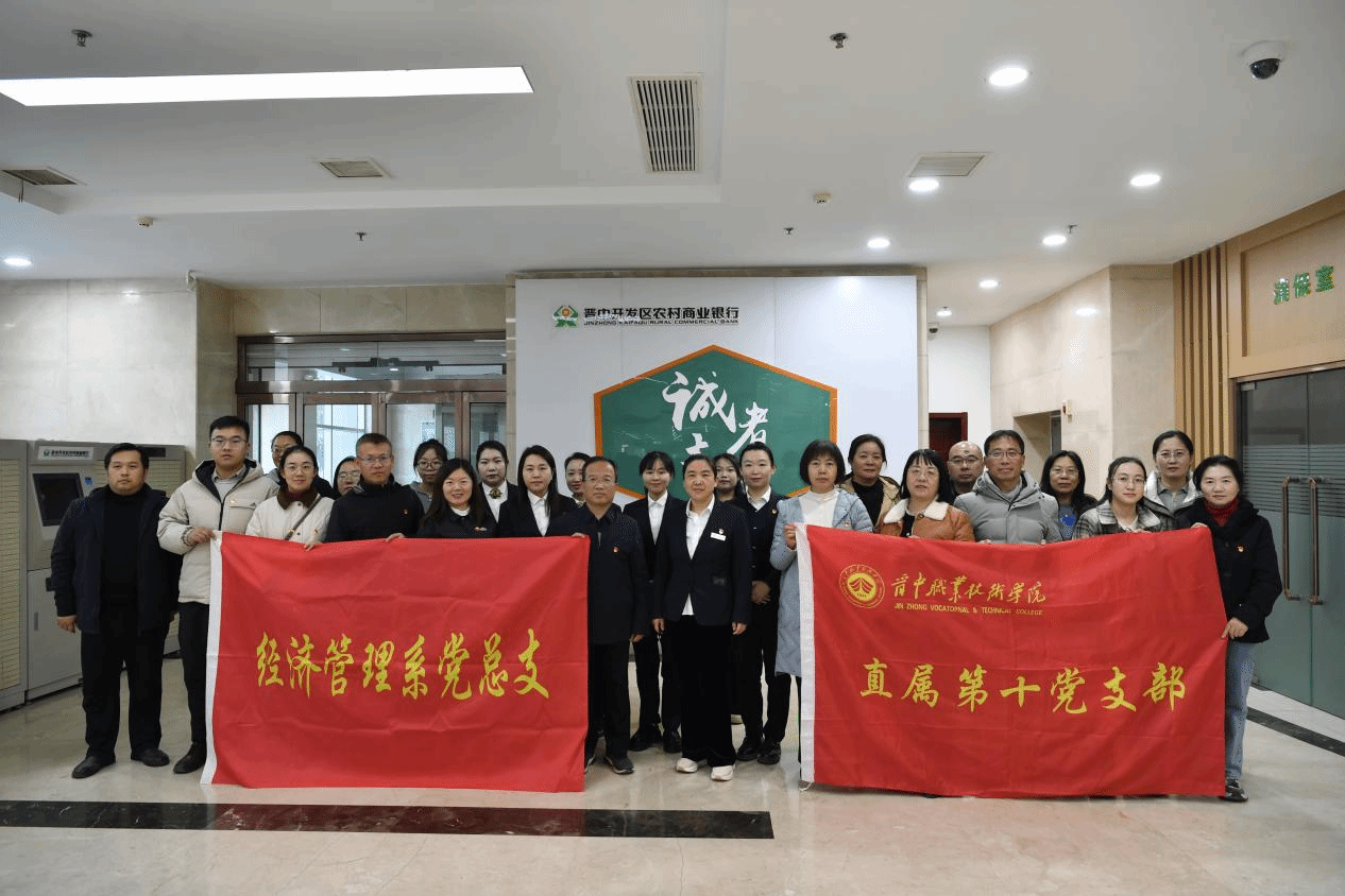 11月19日下午,晋中职院经济管理系党总支联合学院直属第十党支部,赴晋中开发区农村商业银行营业部党支部共同开展“深学细悟全会精神 联学共建谱发展新篇”主题党日活动。党员代表们齐聚一堂,以理论学习为基、以交流研讨为要、以实践观摩为翼,共同谱写党建与业务融合发展的新篇章。