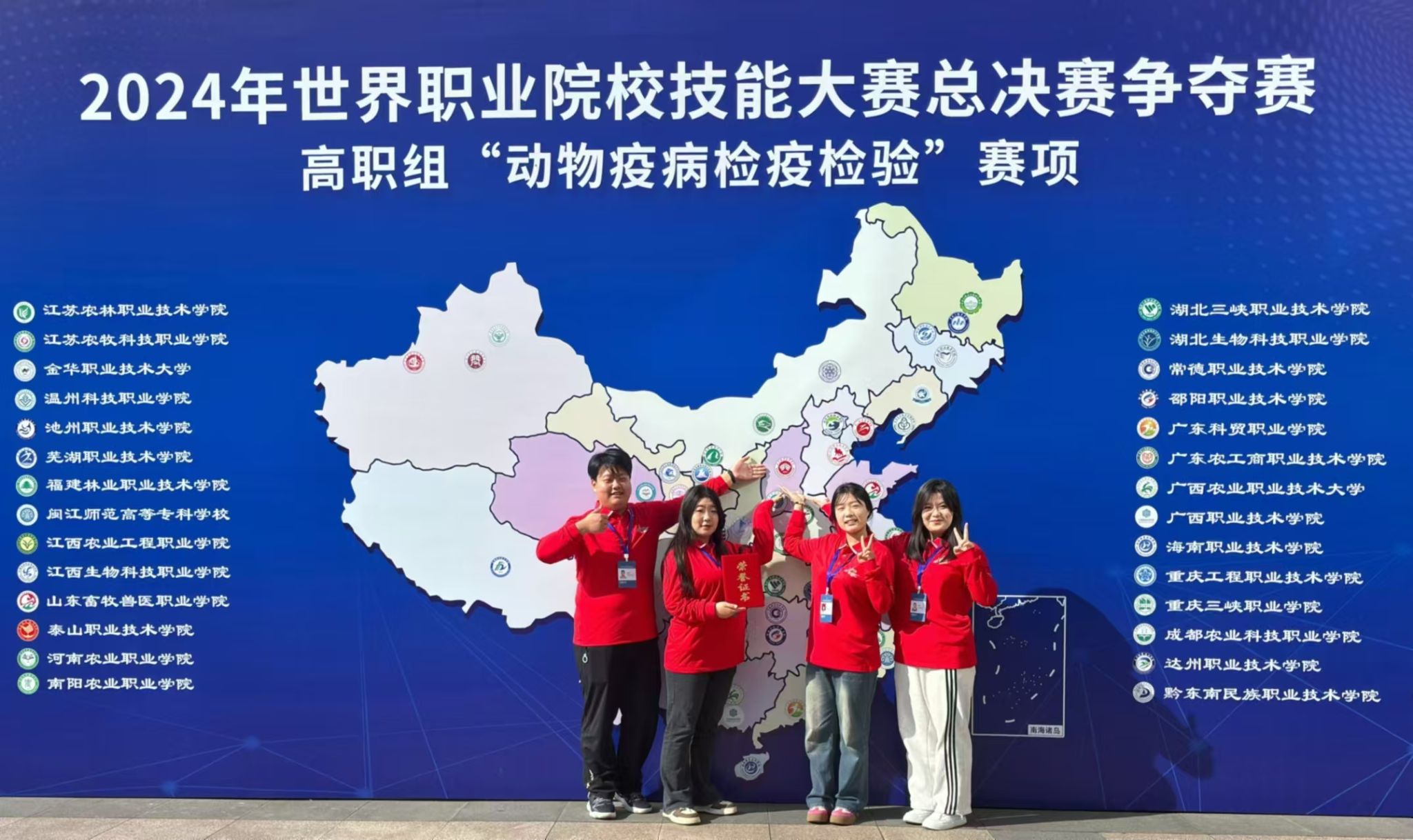 10月29日,2024年世界职业院校技能大赛总决赛——争夺赛高职组“动物疫病检疫检验”赛项在山东潍坊畜牧兽医职业学院落下帷幕。来自全国各省、市、自治区的56支代表队,175名选手同台竞技。经过两天的激烈比拼,生物工程系的畜牧兽医学子连亚灵、魏相海、郑向阳、殷悦组成的团队团结协作、奋力拼搏,斩获该赛项的铜奖。