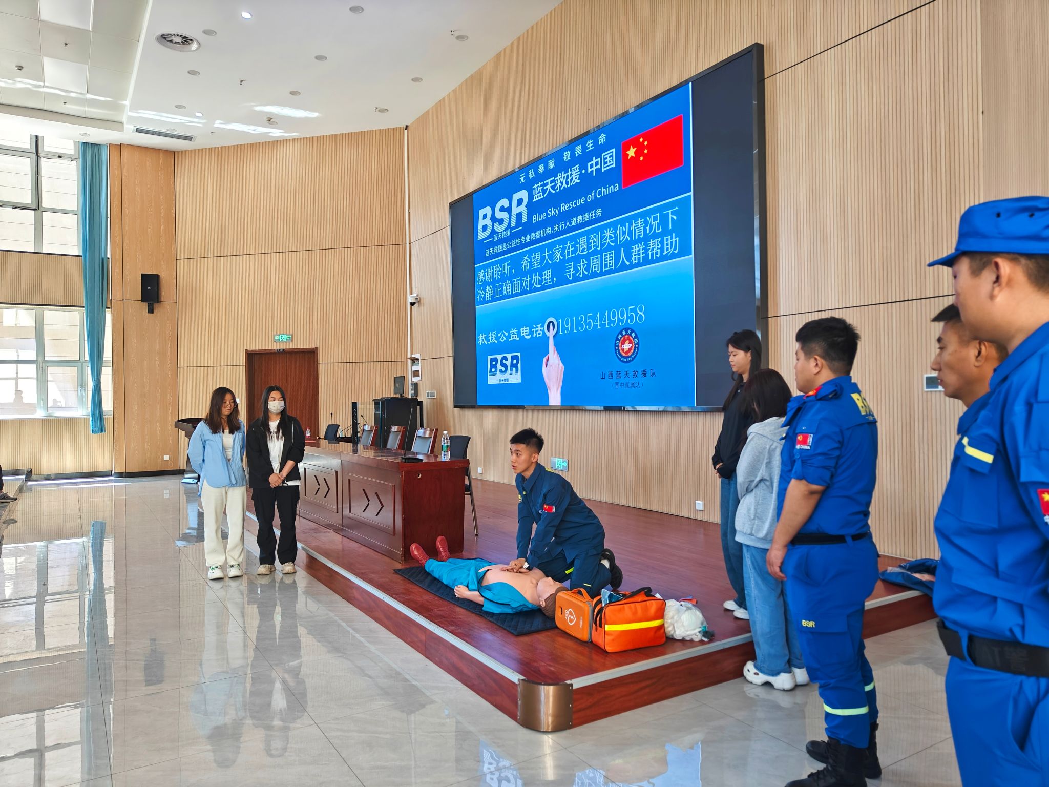 在活动中,晋中蓝天救援队队长通过地震宣传短片、PPT图片讲解、知识竞答等方式,从地震基本知识、防震准备、不同场所避震方法、震后自救要点、灾后措施等五方面进行全面细致的讲解,让师生们明确地震应急的基本步骤,熟悉应急避震和安全疏散的方法,灾难来临时的逃生路线等。随后,救援队员现场演示心肺复苏、AED除颤仪使用、海姆立克急救法,并邀请同学们进行实操练习,让大家能掌握基本安全实操技能,增强处理紧急情况的能力。