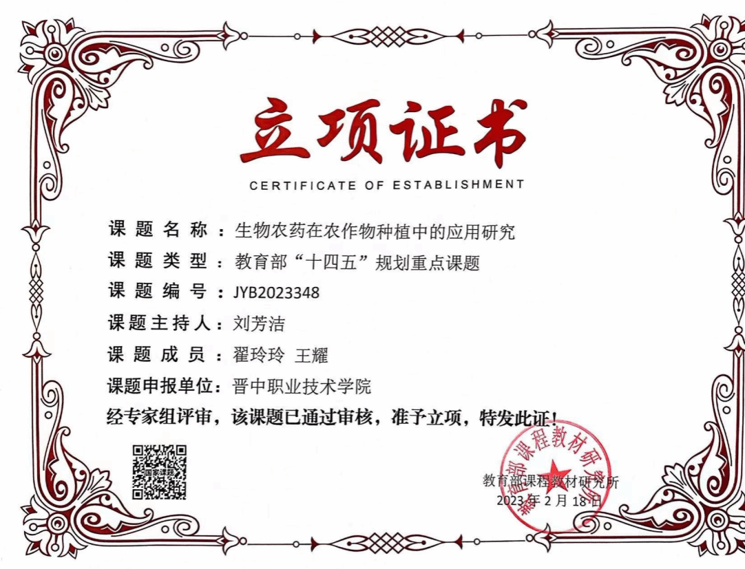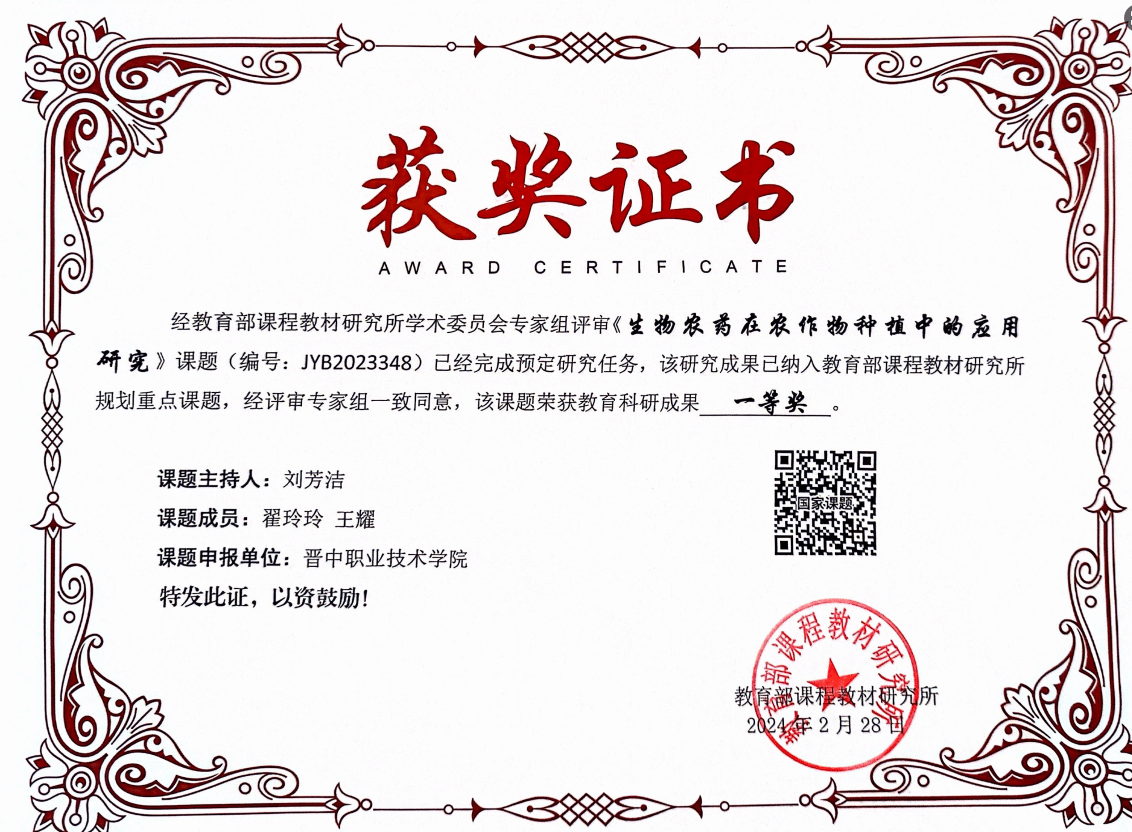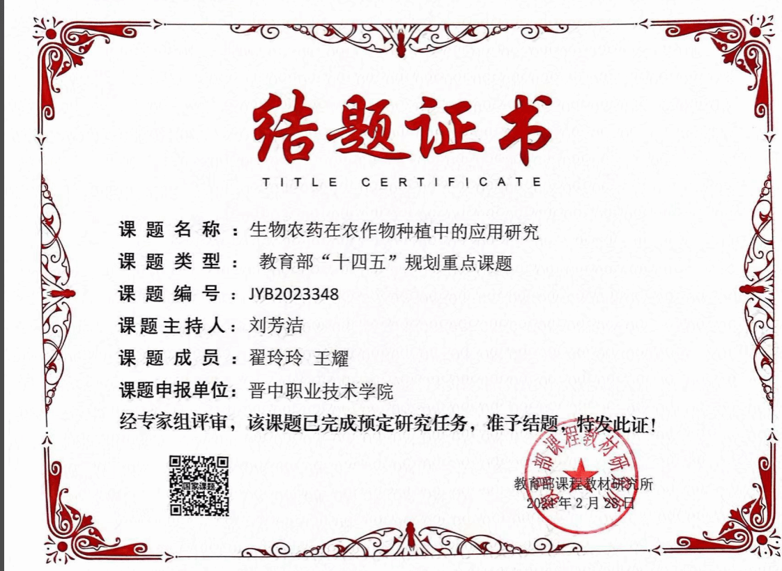 经教育部课程教材研究所学术委员会专家组评审,由我系刘芳洁老师主持的《生物农药在农作物种植中的应用研究》课题,编号JYB2023348,已经完成预定研究任务,该研究成果被纳入教育部课程教材研究所规划重点课题,荣获教育科研成果一等奖。