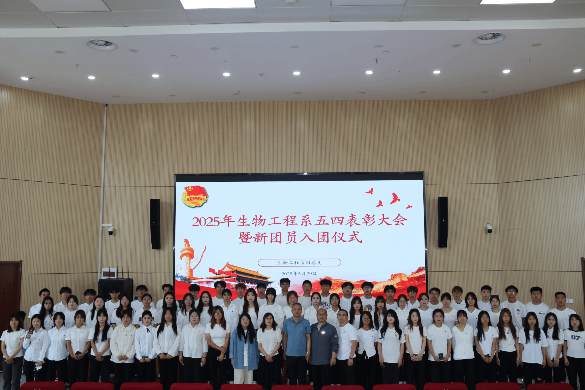 最后,大家齐唱团歌,本次五四表彰大会暨新团员入团仪式圆满完成。这是一次荣光加冕、能量补给,也是一次深刻的思政课。相信在未来,生物工程系的青年们定能以此激励自身,不负五四精神、不负韶华,在青春的赛道上奋力奔跑,在拼搏中绽放不负时代、不负人民的青春之花,让青春之花在全面建设社会主义现代化国家的火热实践中绽放!