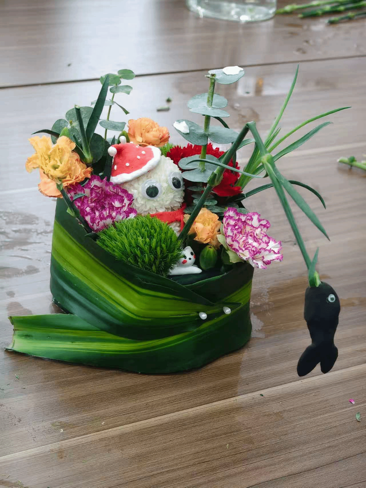实操环节中,刘老师亲手示范剥叶、醒花等花材处理技巧,针对核心的乒乓菊“雪人”组合要领,更是放慢节奏分步拆解,确保每位同学都能清晰掌握。同学们跃跃欲试,在遵循基础原理的前提下大胆发挥创意:有的用绚烂配花为“雪人”点缀亮色,有的通过调整花材角度赋予其灵动神态,每件作品都凝聚着独特巧思。刘老师则穿梭其间,实时答疑解惑、精准指导,为同学们的创意落地保驾护航。