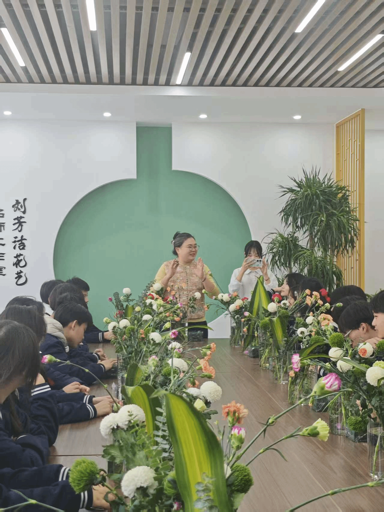 活动伊始,同学们有序落座花艺室,刘老师以风趣鲜活的讲解拉开课堂序幕,瞬间点燃大家的参与热情。恰逢冬至将至,作为岁寒时节的重要节点,刘老师巧妙设定“雪人”为创作主题,既贴合节气特色,又暗藏童趣巧思,让同学们满怀期待投入这场花艺创作之旅。